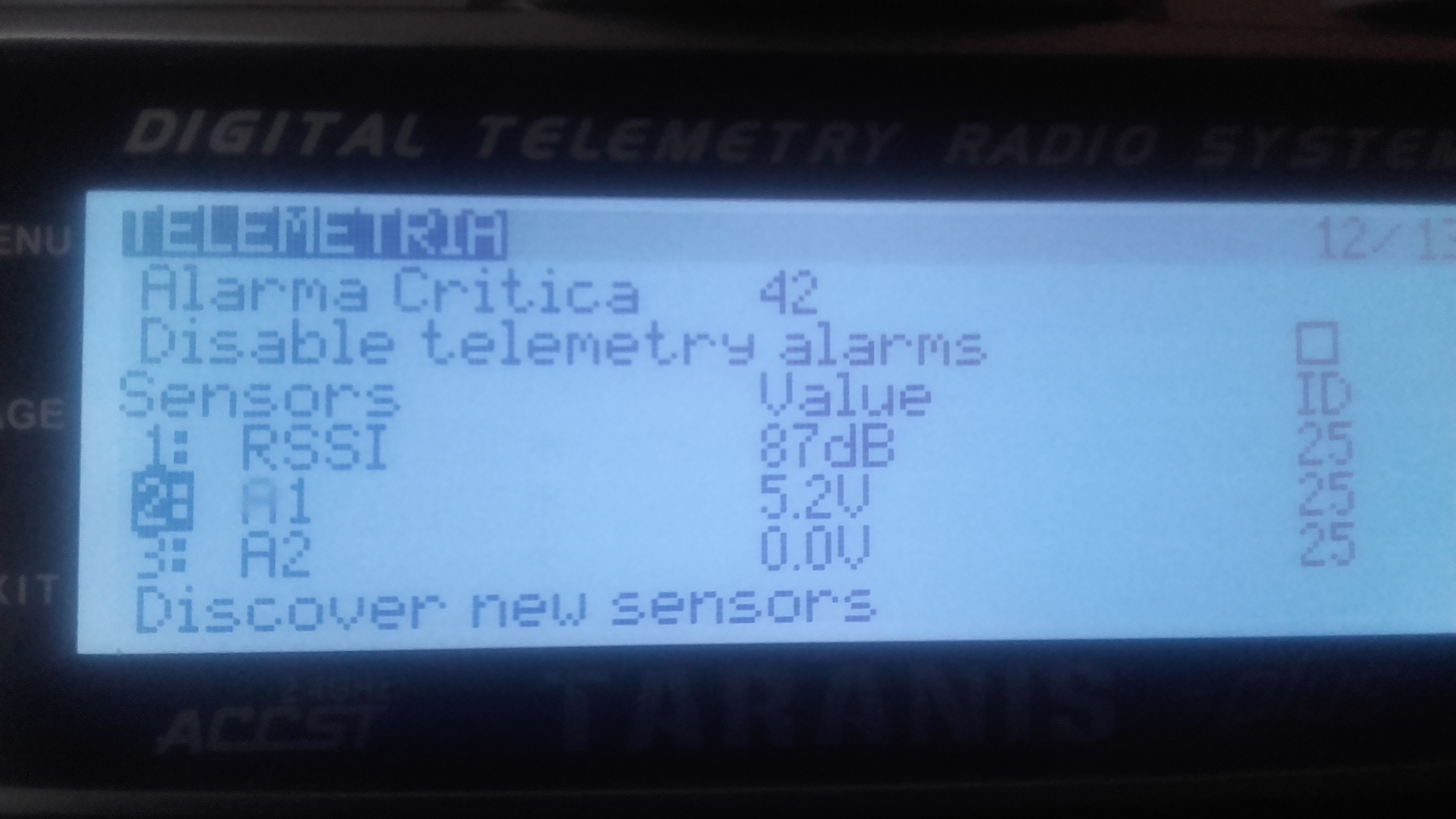 Ahora lo pongo en el avion y todos los canales van bien, pero tengo puesto un sensor de voltaje que funciona bien, (comprobado despues con otro receptor), que en su pantallita salen los valores correctos que le esta dando la bateria pero en la emisora sale una cosa muy rara, te comento, ahora al conectar el sensor de voltaje para telemetria, me da datos falsos por ejemplo, Bateria 2S sale (A1 con 5.20V) - (A2 con 0,00V), ahora pongo una Bateria de 3S y sale los mismos valores, (A1 con 5.20V) - (A2 con 0,00V) estos valores se ven en la pantalla de la emisora, en la pantallita del sensor se ve lo real, llevo horas intentando cambiar los valores pero imposible ponerlo en orden, con el otro receptor va bien, no se si te abra ocurrido a ti algo parecido o sabes por donde van los tiros, creo que esta bien explicado de todo lo que he ido haciendo, a ver si me puedes ayudar, gracias de antemano .