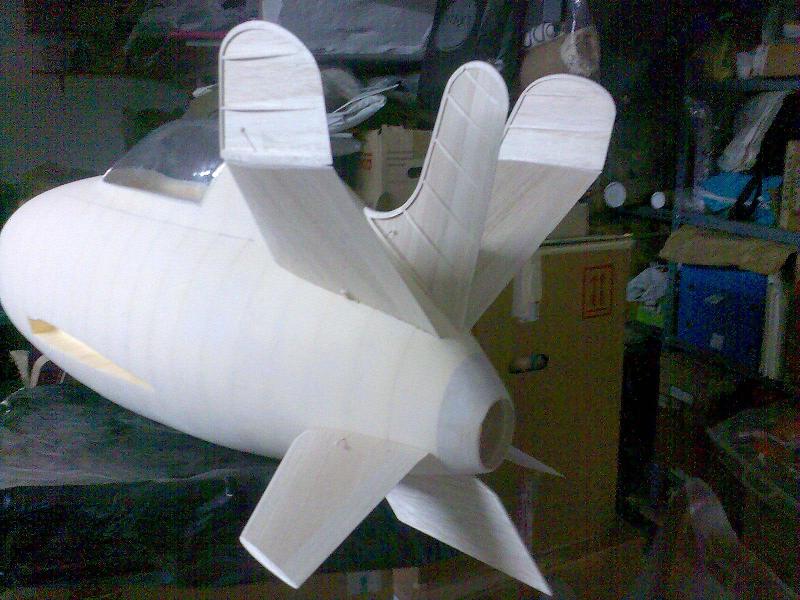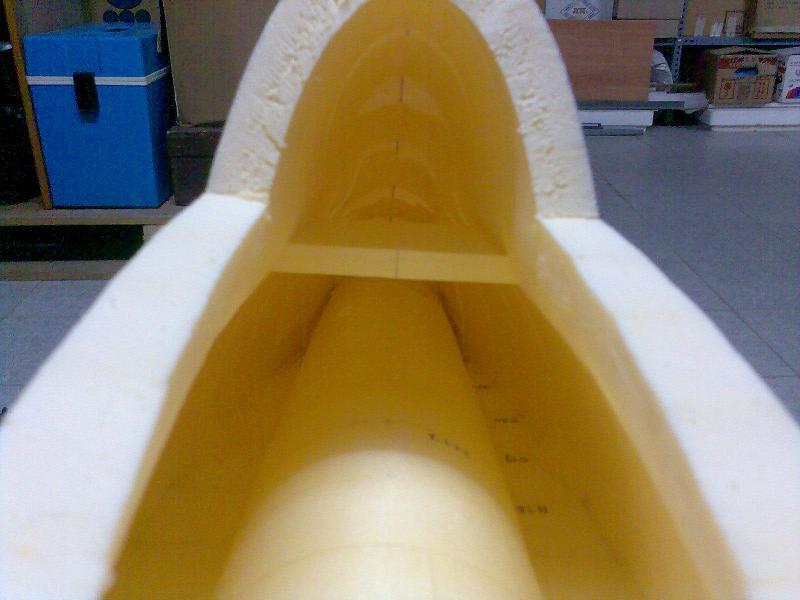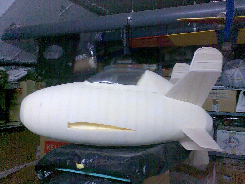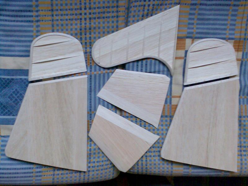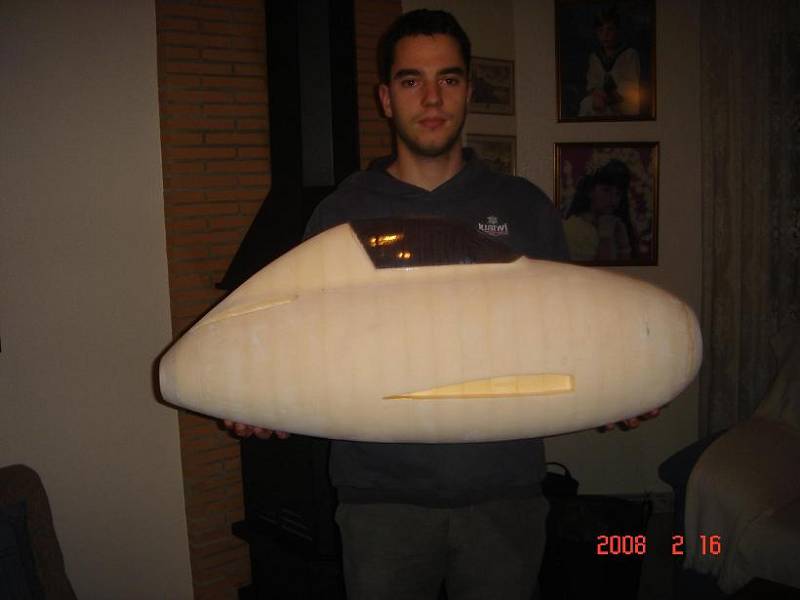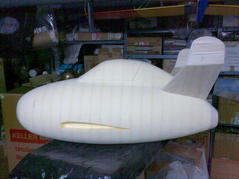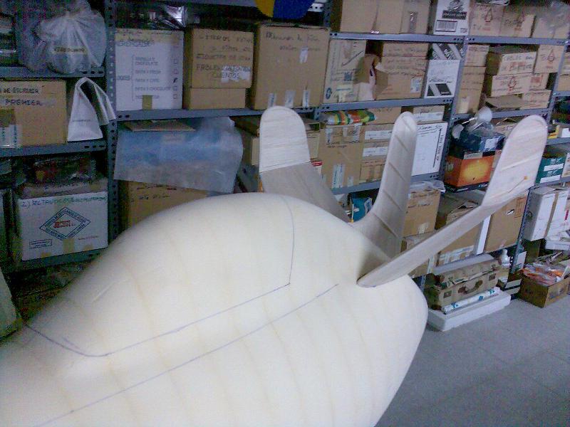 Eso en cuanto al real, en cuanto al rc, pues la verdad es que gran medida de culpa la tiene mi estimado amigo Juanpe (Juan Pedro Guirao Gil) quien me levantó el interés por el vuelo PSS, así que no se me ocurrió nada mejor que construirme este como modelo PSS, no hace falta decirme que estoy loco para construirme precisamente este modelo para PSS, más que nada me gusta el modelo y bueno quería probar algo nuevo. Así que como de costumbre acudimos a nuestra querida pagina de airwar, y con el triptico pues hacemos el plano, autocad, horas, bla bla y nos ponemos manos a la obra. La idea es desde luego hacerlo ligero, claro esta como PSS, el resultado final ya veremos. El fuselaje está hecho con planchas de foam de 4cm, para todas ellas diseñe las plantillas que luego recorte con un arco de corte. Luego las pegué todas juntas y ahora me falta enfibrar y tal (sí, por darle algo de más rigidez, ahora mismo tal cual no me convence mucho). La timonería, que no es poca, son 8 piezas en total, esta hecha en balsa perfilada, excepto la vertical inferior que será de apoyo. Las alas, considerando mi falta de tiempo :S, se las encargue a Javi (Javier López), desde aquí le mando las gracias por su buen trabajo. Y nada más, unas fotos para ilustrar esto un poco: