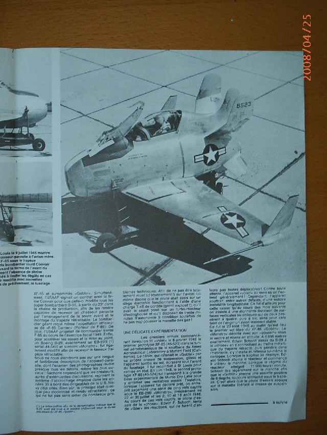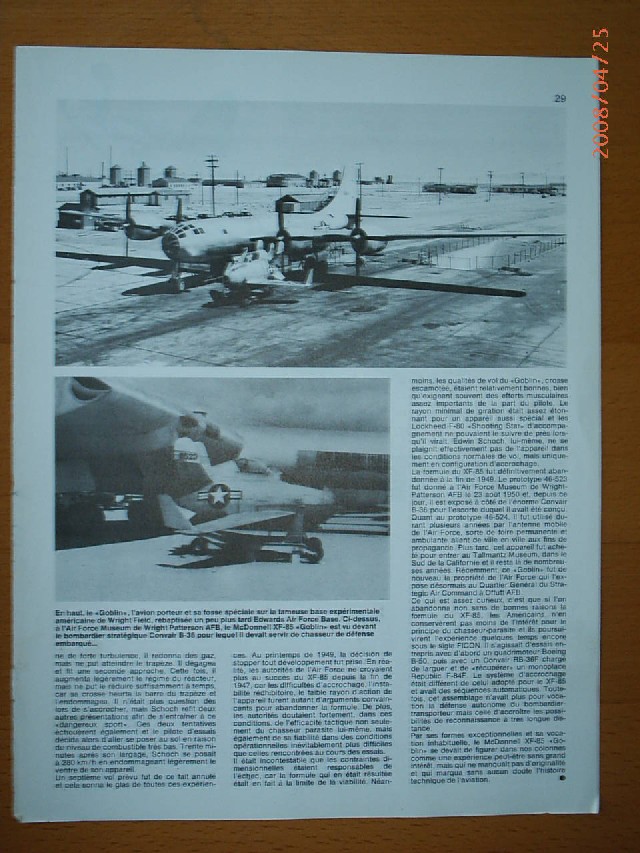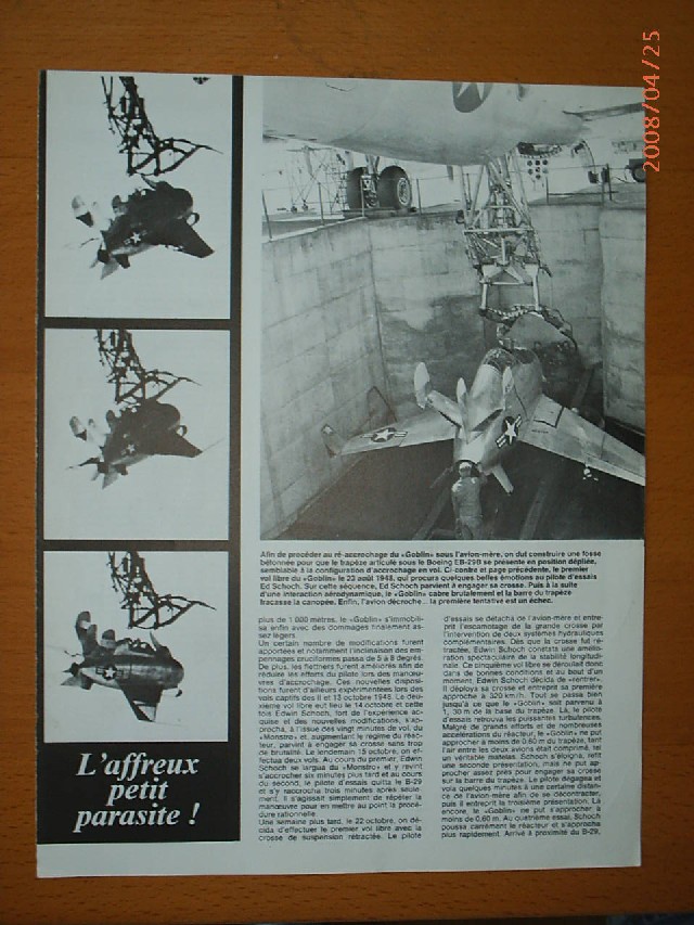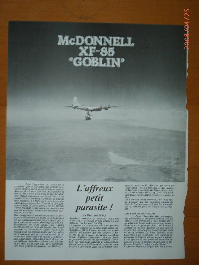 El diminuto Goblin seguiría un concepto similar: el B-36 entraría en territorio enemigo con su caza de escolta en la bodega de bombas; si era atacado por aviones enemigos, el bombardero bajaría al Goblin en un trapecio y lo liberaría para que se enfrentara a los agresores. Una vez puestos en fuga, el caza parásito regresaría al bombardero, enganchándose al trapecio por medio de un gancho retráctil, plegando las alas y siendo recogido de nuevo en la bodega de bombas.