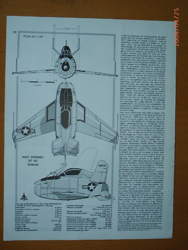 Con este prometedor proyecto, la USAAF encargó dos Goblin en marzo de 1947. Pese a las evidentes limitaciones de un avión tan pequeño (sólo medía 4.3 m de longitud, por 6.42 m de envergadura y 2.50 de altura) resultó un diseño limpio y hasta cierto punto, elegante. Pesaba algo más de dos toneladas y su planta motriz era un reactor Westinghouse XJ-34 de 1.300 kg de empuje, dándole una velocidad de poco más de 1000 km/h al avión a reacción más pequeño del mundo. Su armamento era de cuatro ametralladoras de 12.7 mm. Por supuesto, carecía de tren de aterrizaje, y si no era capaz de engancharse al bombardero, el piloto debía confiarse a unos patines en el fuselaje y unas ruedas en las puntas de las alas en caso de emergencia ( y todos sabemos lo “fácil” que resulta aterrizar sobre un patín, léase Me-163 Komet)