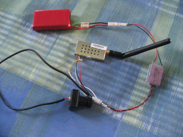 El conjunto de transmisor con lipo 2s+ regulador. Por otro lado, alimentacion de camara y tx unidos en un conector para ir al regulador