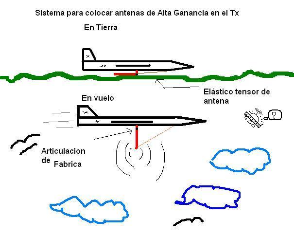 Al Tx le voy a poner una antena de 9 Dbi onmi,,,es larga, tiene 38 cm, pero se articula en su base 90 grados,, entonces la pondré mirando hacia el piso ( vertical) como aconsejan, le pondré tb una banda elastica desde la punta d la antena al fuselaje,, asi la antena esta recta en el vuelo, pero al tocar tierra, se articula y se dobla hacia atras,,, lo mismo para despegar : articulada en tierra y al tomar vuelo la banda elastica la pone recta.. le pondré algun protector en la punta para q el suelo no me la lije.. q te parece...