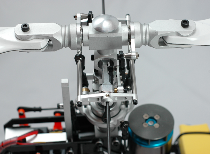 es impresionante , tiene unos detalles dignos de mencion, como que el bloqueo del plato tiene un rodamiento para guia, los porta palas van sobre rodamientos de presión, todo es aluminio sobre rodamientos, LA varilla de transmisión de cola va guiada con anillas !!! como los grandes, los mandos de puspull de los servos ya le gustaría a mi SKIPPER50 ir así de bien (sin nada de orgura y finos).