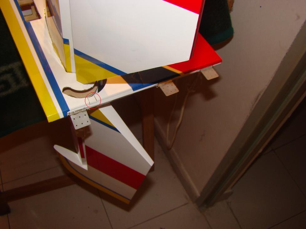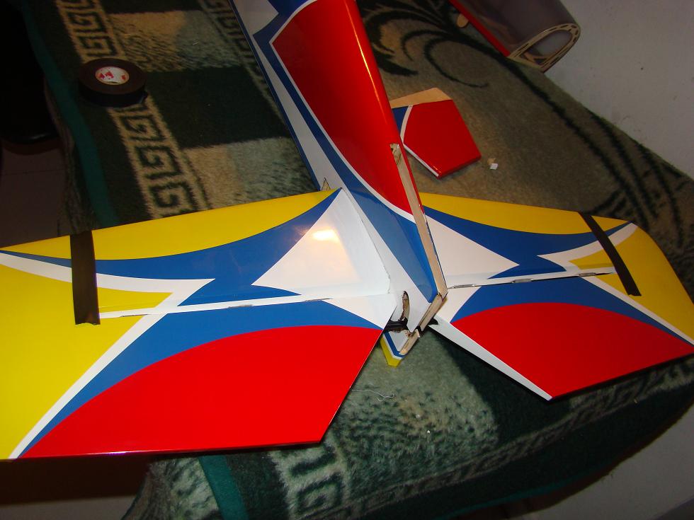 pegado del timon de profundidad, aqui, primero pegamos una parte del timon, con el pasador que trae de carbono, despues para una perfecta alineacion con la otra mitad de la profundidad, coloco cinta aislante.